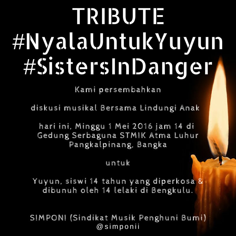 Banyak netizen yang bersimpati dengan membuat beragam gambar gambar yang bertuliskan aksi perlawanan dan solidaritas terhadap meniggalnya Yunyun, siswi SMP di Desa Padang Ulak Tanding, Rejang Lebong, Bengkulu yang diperkosa oleh 14 Pemuda saat ia hendak pulang sekolah.